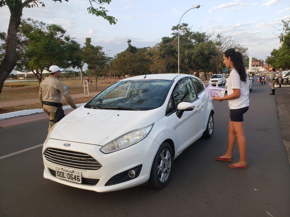 Ao abordarem os motoristas de veículos, motocicletas e pedestres, os agentes fizeram uma panfletagem e a distribuição de souvenir - uma lixeirinha para veículo - todos com o slogan : **