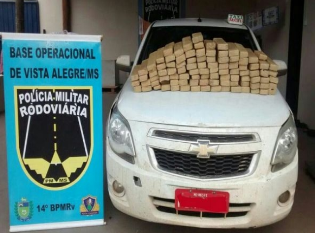 A Polícia Militar Rodoviária Estadual da Base Operacional de Vista Alegre, Distrito de Maracaju, apreendeu nesta manhã (05), às 09:40h na Rodovia MS 164, KM 014, em frente a Base, 77,3 Kg (setenta e sete quilos e trezentos gramas) de maconha, distribuídos em 94 tabletes escondidos em “mocós” nas quatro portas, nos assentos e encostos bancos e no para-choque traseiro do veículo.