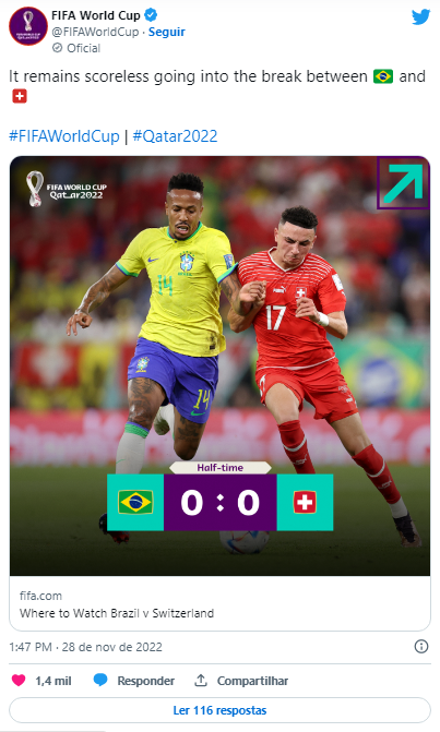 Aos 31 foi opróprio Raphinha que arrisca de fora da área, no meio do gol, para o goleiro suíço encaixar. Aliás, encaixada foi como a equipe canarinho ficou durante os primeiros 45 minutos. Sem criatividade, a equipe de Tite caiu na armadilha do suíço Murat Yakin e aceitou o 0 a 0.