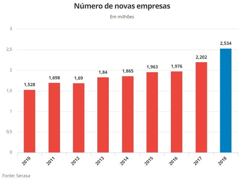 O país criou 2,5 milhões de novas empresas em 2018, batendo o recorde da série iniciada em 2010. Os dados são do Indicador Serasa Experian de Nascimento de Empresas, divulgado nesta terça-feira (26). Os novos negócios cresceram 15,1% na comparação com 2017 (quando surgiram 2,2 milhões de empreendimentos).