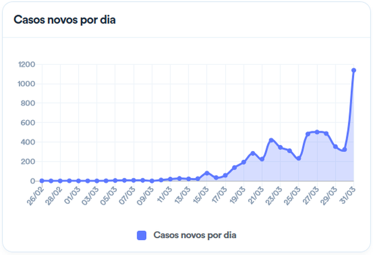 Já os casos confirmados saíram de 4.579 para 5.717. O resultado de novas 1.138 pessoas infectadas em um dia foi mais que o dobro do maior registrado até agora, de 502 novos casos no dia 27 de março.