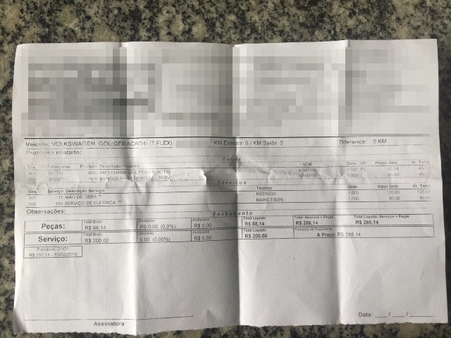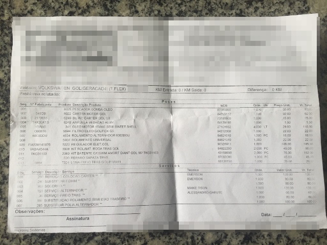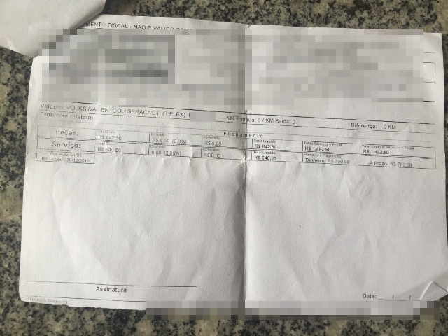 Na manhã do dia seguinte a família entrou em contato com o mecânico que precisou guinchar o veículo até a oficina e após análise dos estragos constatou que a colisão causou avarias nos rolamentos, Carter, vedação, regulador elétrico, lona do freio entre outros e o reparo ficaria em R$1.482,50.