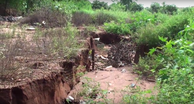 Como se já não bastasse a dificuldade em transitar pelas ruas, ainda existe um terreno vazio ao lado do centro de tratamento de esgoto,onde se formou uma cratera que a cada chuva avança em direção às casas que ficam nas proximidades,estando hoje a cerca de 20 metros de distancia das residências.
