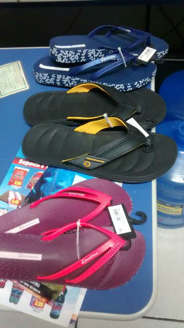 As imagens da central de monitoramento da estabelecimento registrou o momento que duas mulheres furtavam pares de chinelo da gôndola do supermercado enquanto uma terceira mulher dava cobertura no crime e não foi registrada pelas câmeras.