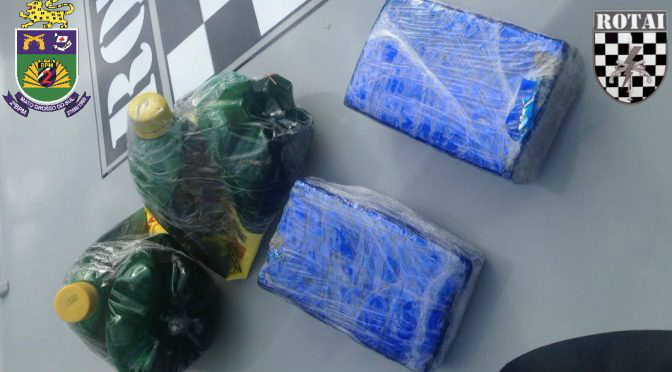 Os itens foram localizados nas proximidades da muralha da unidade prisional e uma guarnição da ROTAI (Rondas Ostensivas Táticas do Interior) foi acionada para verificar a situação, localizando no local uma sacola plástica contendo dois tabletes de maconha, que após pesagem totalizaram 900g e duas garrafas, tipo pet, com cachaça.