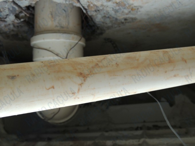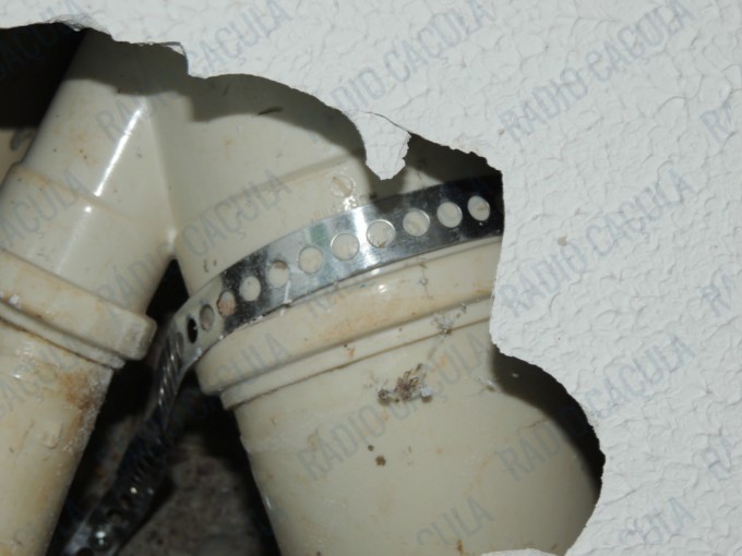 Com dois filhos pequenos a mulher não sabe o que fazer pois, segundo ela, as fezes e detritos do apartamento acima, estão caindo no teto do seu banheiro devido a um encanamento quebrado.