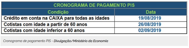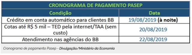 Essa liberação das cotas do PIS/Pasep foi feita por meio da Medida Provisória 889/2019, anunciada pelo governo no início do mês. Pela MP, também houve liberação de saques do Fundo de Garantia do Tempo de Serviço (FGTS). A liberação das cotas é diferente do pagamento anual do abono salarial. Esse pagamento do calendário 2019/2020 começou no final de julho.