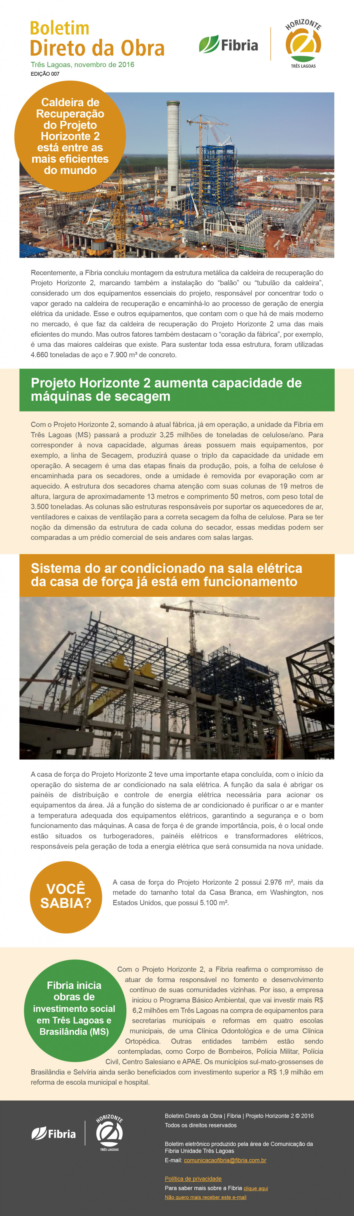Recentemente, a Fibria concluiu montagem da estrutura metálica da caldeira de recuperação do Projeto Horizonte 2, marcando também a instalação do “balão” ou “tubulão da caldeira”, considerado um dos equipamentos essenciais do projeto, responsável por concentrar todo o vapor gerado na caldeira de recuperação e encaminhá-lo ao processo de geração de energia elétrica da unidade. Esse e outros equipamentos, que contam com o que há de mais moderno no mercado, é que faz da caldeira de recuperação do Projeto Horizonte 2 uma das mais eficientes do mundo. Mas outros fatores também destacam o “coração da fábrica”, por exemplo, é uma das maiores caldeiras que existe. Para sustentar toda essa estrutura, foram utilizadas 4.660 toneladas de aço e 7.900 m³ de concreto.