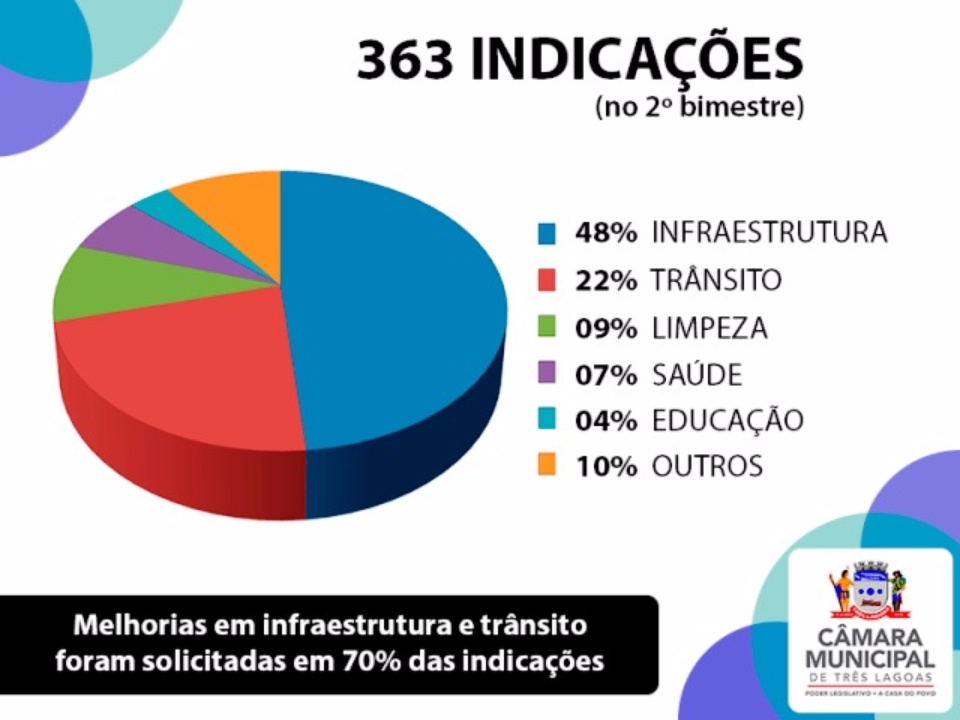 Neste bimestre, o principal destinatário das indicações foi a Secretaria de Infraestrutura, Transporte e Trânsito, que recebeu 271 indicações. O segundo mais requisitado foi o prefeito, que recebeu 47.