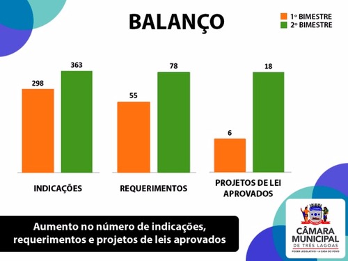A produtividade dos vereadores de Três Lagoas registrou novo crescimento, no segundo bimestre de 2017, reafirmando o objetivo de ser a Câmara mais dinâmica da história do município. Para se ter uma ideia, somente em abril e maio, a Casa apresentou 363 indicações, um aumento de 21,8% em relação ao bimestre anterior, que teve 298 indicações. O índice de requerimentos cresceu 41,8%, saltando de 55 para 77, em igual período. Mas o grande indicador da produtividade legislativa é a apresentação e aprovação de projetos de lei: o segundo bimestre teve a aprovação de 18 PLs, contra seis do primeiro bimestre, ou seja, triplicou.