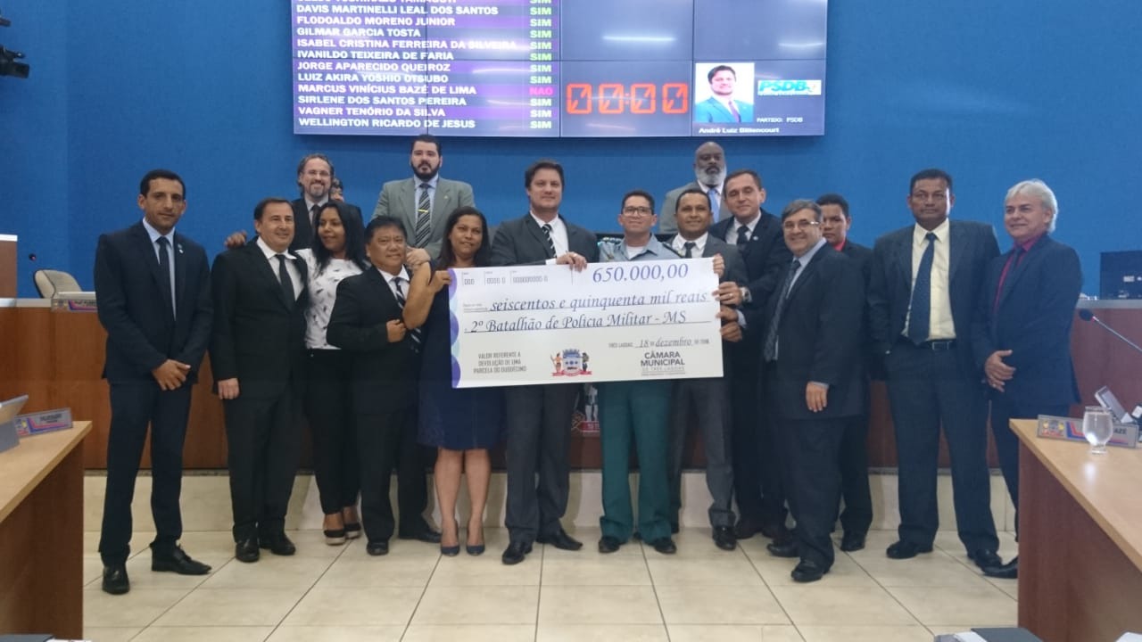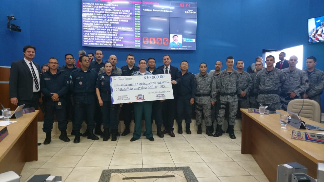 A Câmara de Vereadores de Três Lagoas entregou para o Segundo Batalhão de Polícia Militar (2º BPM), na pessoa de seu Comandante, Major Ênio de Souza Soares, um cheque simbólico no valor de R$ 650 mil referente à devolução do Duodécimo 2018.