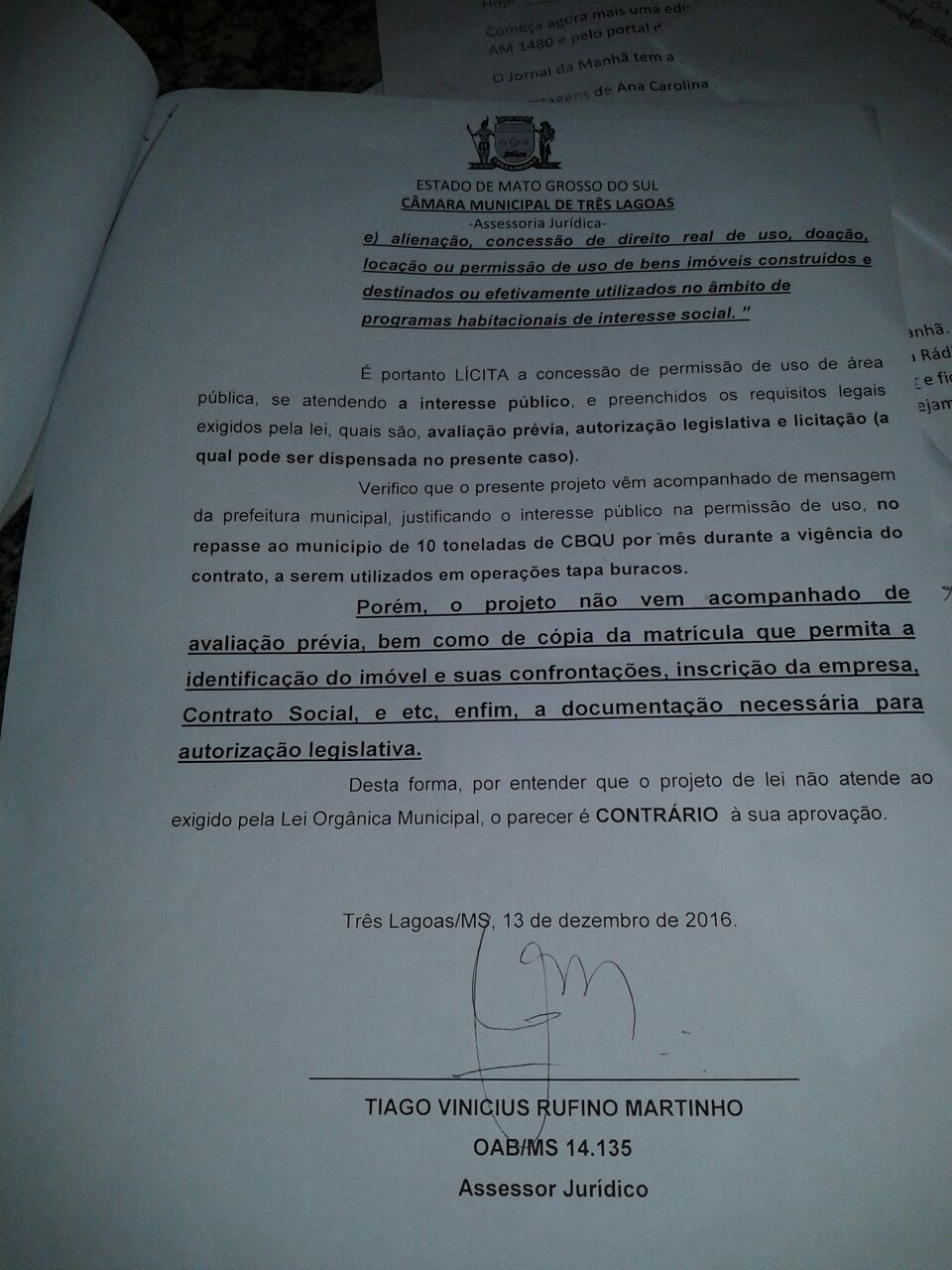 Sendo assim a empresa “pagaria” a Prefeitura uma quantia de material massa asfáltica para ser usado no município, como se fosse um aluguel. No documento abaixo existem os motivos apontados pelo Vereador Jorge Martinho, que votará contra o o projeto na Casa de Leis.