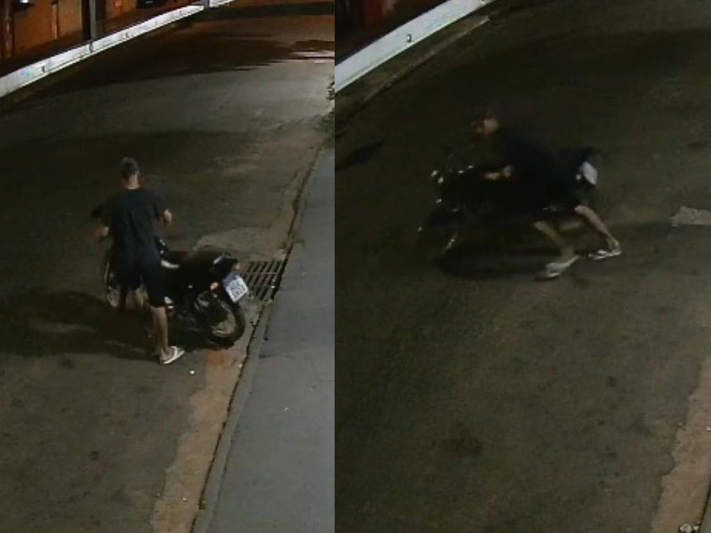 Imagens mostram o momento em que suspeito empurra o veículo e foge, onde polícia pede ajuda da população para localizar a moto.