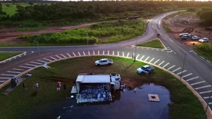 Um caminhão carregado com filés de tilápia tombou na tarde da última sexta-feira, 03, na rotatória do anel viário de Santa Rita do Pardo. O acidente ocorreu por volta das 15h, no trecho que liga as rodovias MS-395 e MS-040.