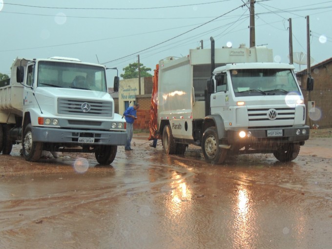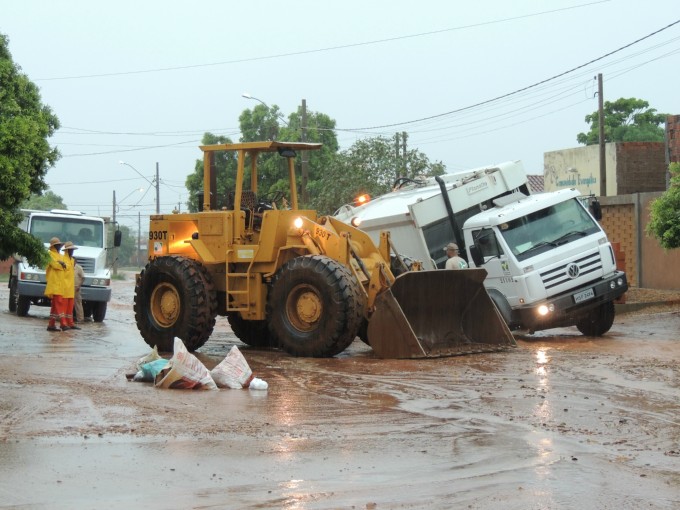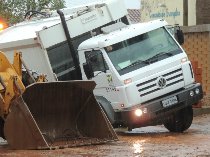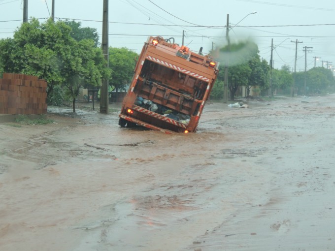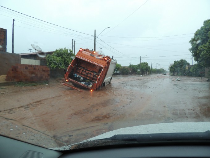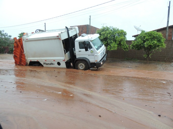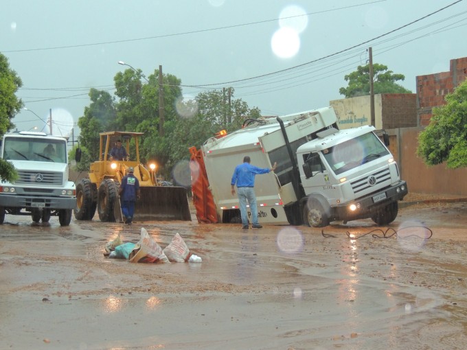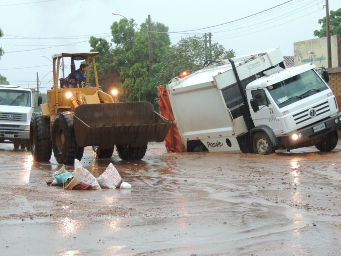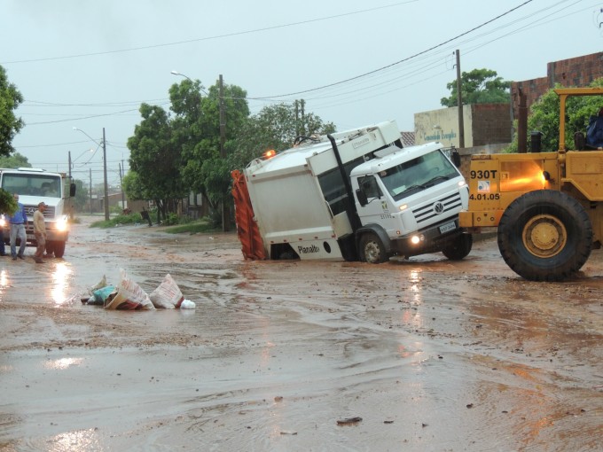 Um caminhão de lixo ficou atolado em um buraco na rua C no bairro Vila Verde durante o período de chuva que caiu na tarde desta terça feira em Três Lagoas.