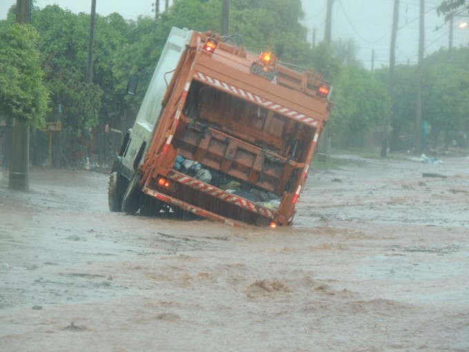 Caminhão de lixo cai em buraco durante a chuva em Três Lagoas