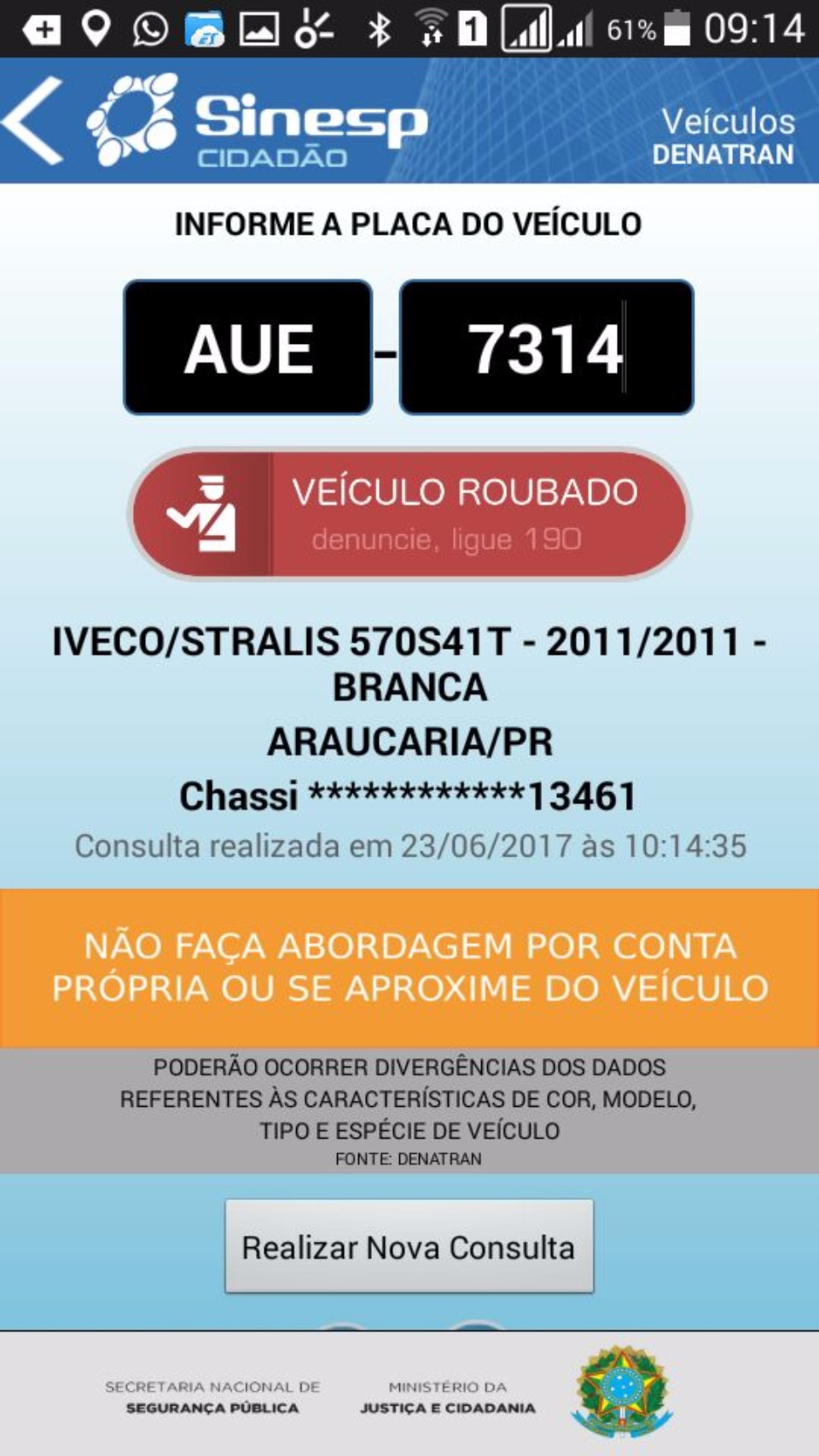 Durante a fiscalização, os oficiais perceberam que o caminhão possuía alguns sinais identificadores inconsistentes e ao realizar uma busca minuciosa, constataram que se tratava de um veículo furtado no ano de 2014 na cidade de Campo Largo (PR).