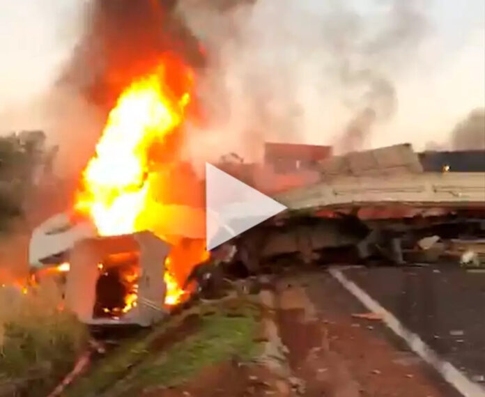 Colisão entre dois caminhões na BR-163 resultou em incêndio na tarde desta quinta-feira (25), entre as cidades de Naviraí e Itaquirai, distante cerca de 400 quilômetros de Campo Grande. Motoristas que passavam pelo local foram até os veículos envolvidos e afirmaram que os condutores dos dois caminhões morreram com a colisão. A informação não foi confirmada pelo Corpo de Bombeiros de Naviraí, que está no local.