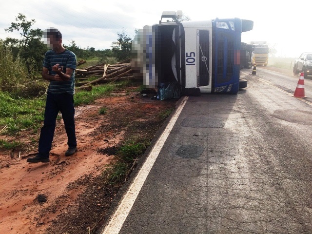 Por sorte, o motorista – que usava devidamente o cinto de segurança não teve ferimentos. Toda a carga ficou espalhada na pista, causando a interdição total até a chegada da PRF que liberou parcialmente a rodovia pelo acostamento.