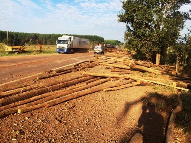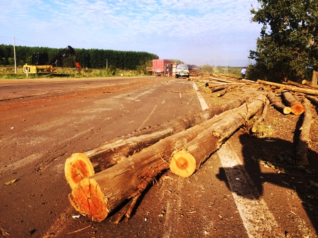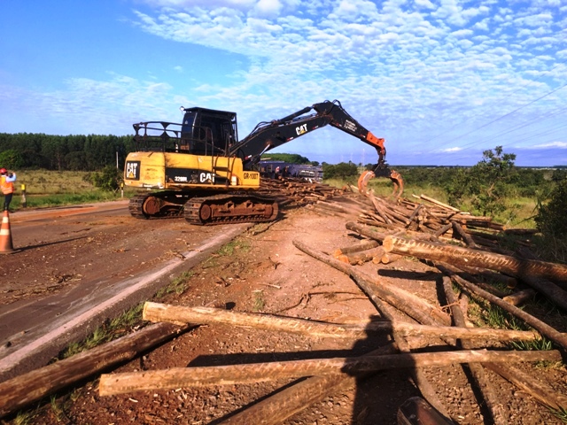 Técnicos da Eldorado Brasil foram ao local com outros caminhões e uma máquina para fazer a retirada dos eucaliptos da rodovia. O trânsito na região deve ser totalmente liberado até o período noturno.