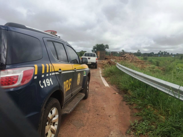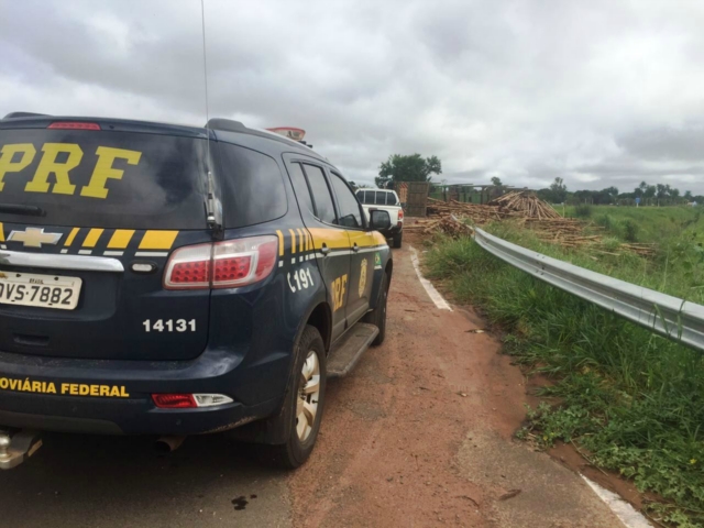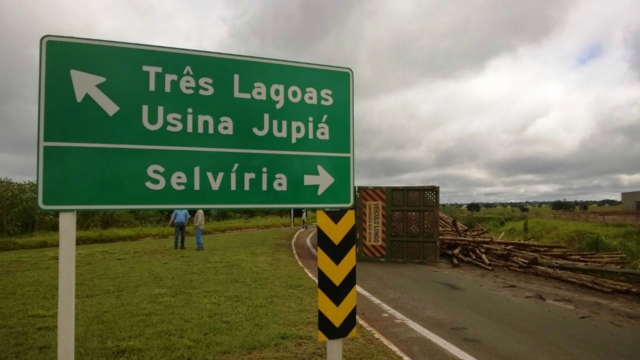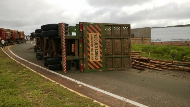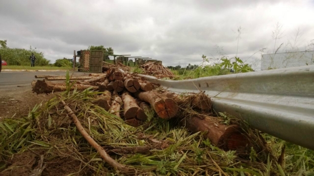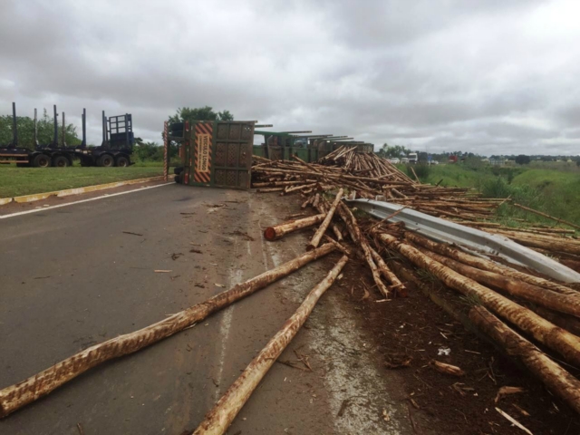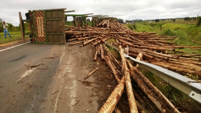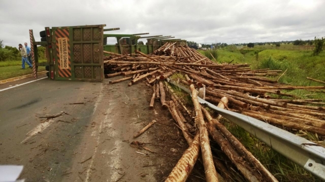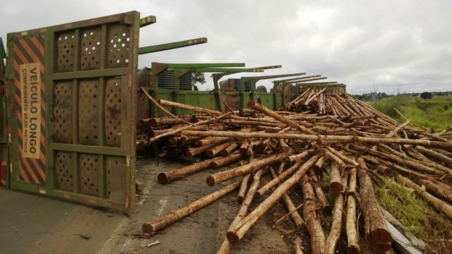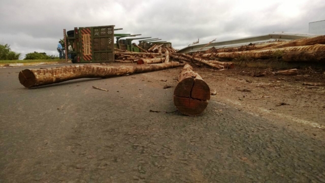 A carga seguia para uma fábrica de celulose e se espalhou pelo canto da pista. Até que a carreta e a madeira sejam removidas, a pisca ficará interditada. O fluxo de veículos é controlado pela Polícia Rodoviária Federal (PRF).