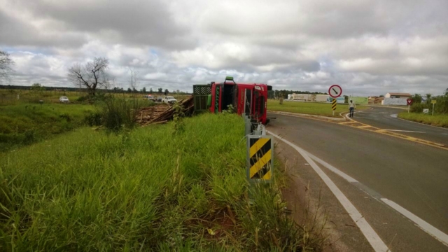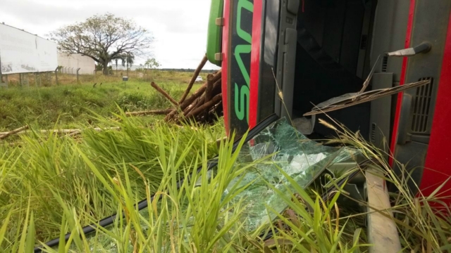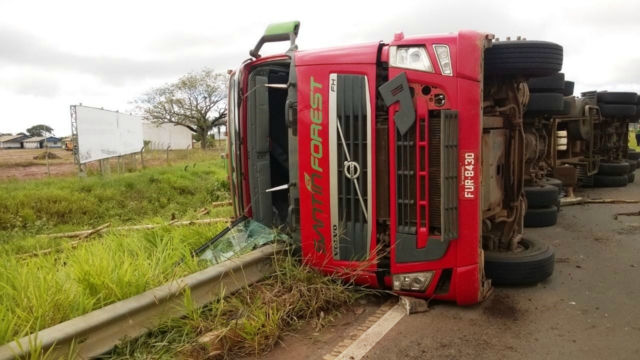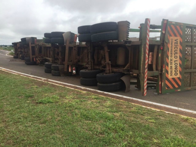 Uma carreta carregada com eucaliptos tombou na manhã desta quarta-feira (11), em Três Lagoas. O fato aconteceu na rotatória de acesso à Selvíria-MS, pela rodovia 158.