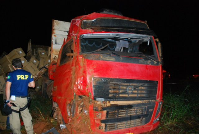 Uma carreta carregada com tonner, tombou na altura do quilômetro 34 da BR-267, na região do pólo industrial de Bataguassu, após o condutor não perceber o início do canteiro e passar direto.