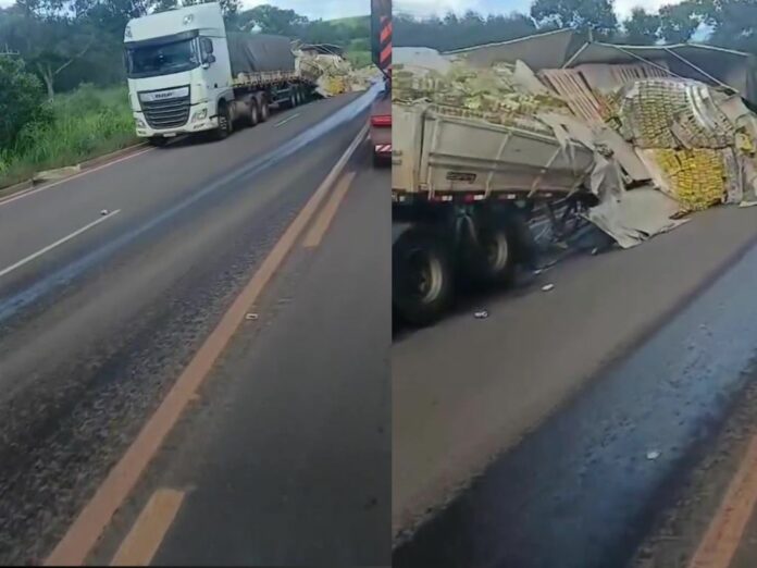 De acordo com informações preliminares, o motorista teria tentado realizar uma ultrapassagem quando acabou se envolvendo em um acidente. Com o impacto, a carga foi completamente espalhada pela pista, chamando a atenção de motoristas que trafegavam pelo local.