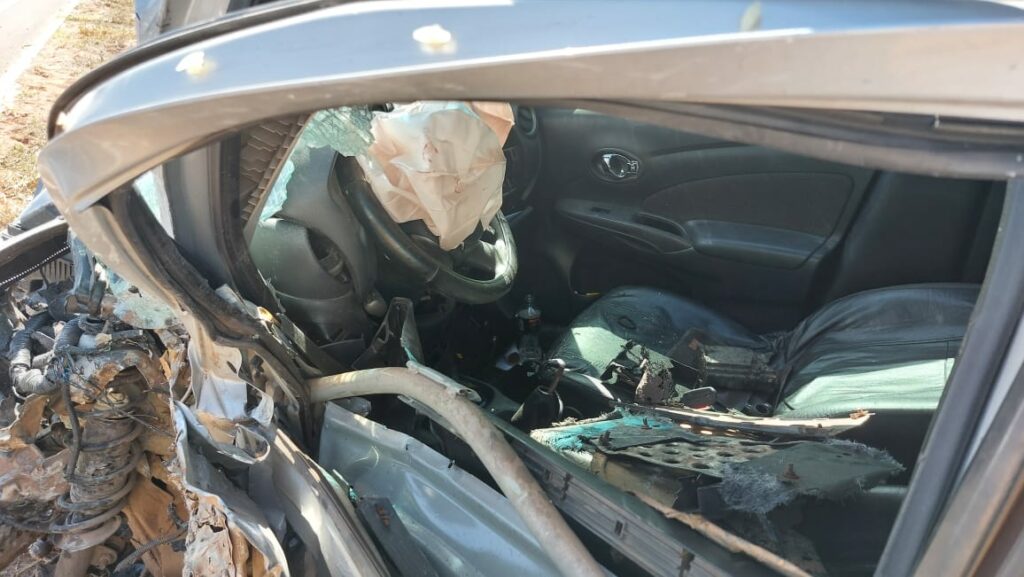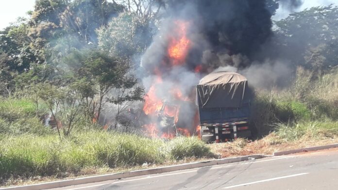 Segundo informações, a colisão entre um carro e uma carreta na via de acesso à Ponte de divisa MS/SP, resultou em um incêndio no veículo de carga.