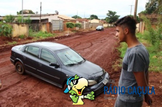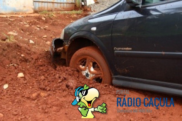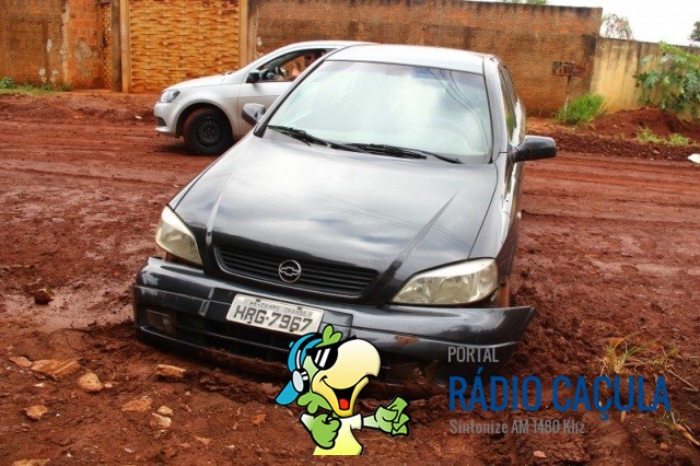 Ao tirar o carro da garagem nesta segunda-feira (4), o mecânico Valdecir Porto de Quadros perdeu controle da direção, deslizou na lama formada pela chuva e atolou o veículo na rua João Ramalho, no bairro Nossa Senhora das Graças. Ele pretende deixar o automóvel no local até que a prefeitura o remova, já que o incidente ocorreu em função de obras de pavimentação.