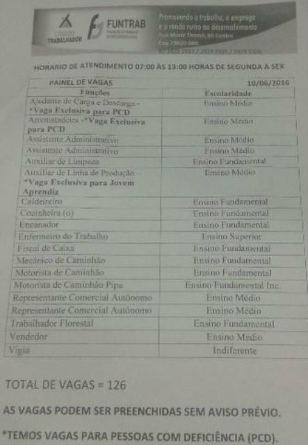 A Casa do Trabalhador de Três Lagoas (MS) disponibiliza 126 vagas para esta sexta-feira (10), sendo elas: