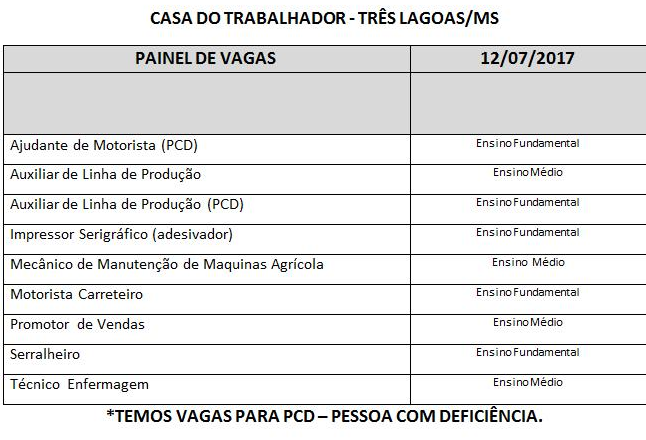 A Casa do Trabalhador de Três Lagoas localizada na Rua Munir Thomé n°86, na área central da cidade, em parceria com a FUNTRAB – Fundação do Trabalho de Mato Grosso do Sul divulga o quadro de vagas disponíveis para esta quarta-feira (12).