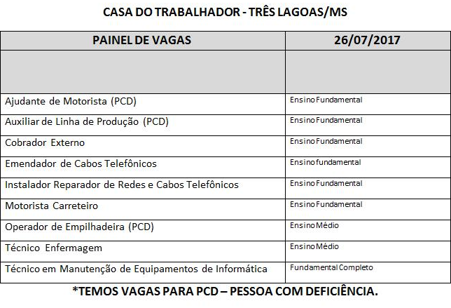 A Casa do Trabalhador de Três Lagoas localizada na Rua Munir Thomé n°86, na área central da cidade, em parceria com a Funtrab – Fundação do Trabalho de Mato Grosso do Sul divulga o quadro de vagas disponíveis para esta quarta-feira (26).