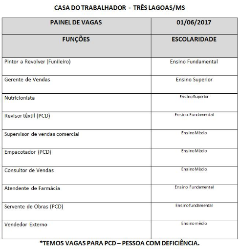 A Casa do Trabalhador de Três Lagoas localizada na Rua Munir Thomé n°86, na área central da cidade, em parceria com a FUNTRAB – Fundação do Trabalho de Mato Grosso do Sul divulga o quadro de vagas disponíveis para esta quinta-feira (01).