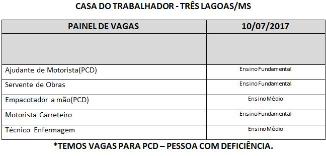 A Casa do Trabalhador de Três Lagoas localizada na Rua Munir Thomé n°86, na área central da cidade, em parceria com a FUNTRAB – Fundação do Trabalho de Mato Grosso do Sul divulga o quadro de vagas disponíveis para esta segunda-feira (10).