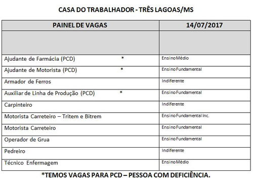 A Casa do Trabalhador de Três Lagoas localizada na Rua Munir Thomé n°86, na área central da cidade, em parceria com a FUNTRAB – Fundação do Trabalho de Mato Grosso do Sul divulga o quadro de vagas disponíveis para esta segunda-feira (17).