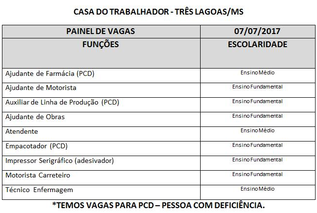 A Casa do Trabalhador de Três Lagoas localizada na Rua Munir Thomé n°86, na área central da cidade, em parceria com a FUNTRAB – Fundação do Trabalho de Mato Grosso do Sul divulga o quadro de vagas disponíveis para esta sexta-feira (07).