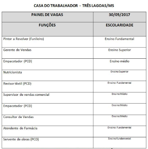 A Casa do Trabalhador de Três Lagoas localizada na Rua Munir Thomé n°86, na área central da cidade, em parceria com a FUNTRAB – Fundação do Trabalho de Mato Grosso do Sul divulga o quadro de vagas disponíveis para esta terça-feira (30).