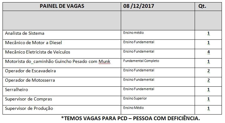 Para hoje as vagas disponíveis são para os cargos Analista de Sistema, Mecânico de Motor a Diesel, Mecânico Eletricista de Veículos, Motorista do caminhão guincho pesado com Munk, Operador de Escavadeira, Operador de Motosserra, Serralheiro, Supervisor de Compras, Supervisor de Produção.