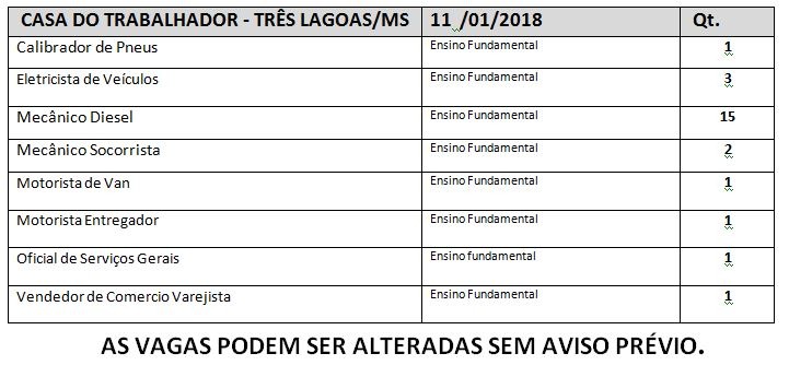 Para hoje as vagas disponíveis são para os cargos Calibrador de Pneus, Eletricista de Veículos, Mecânico Diesel, Mecânico Socorrista, Motorista de Van, Motorista Entregador, Oficial de Serviços Gerais e Vendedor de Comercio Varejista.