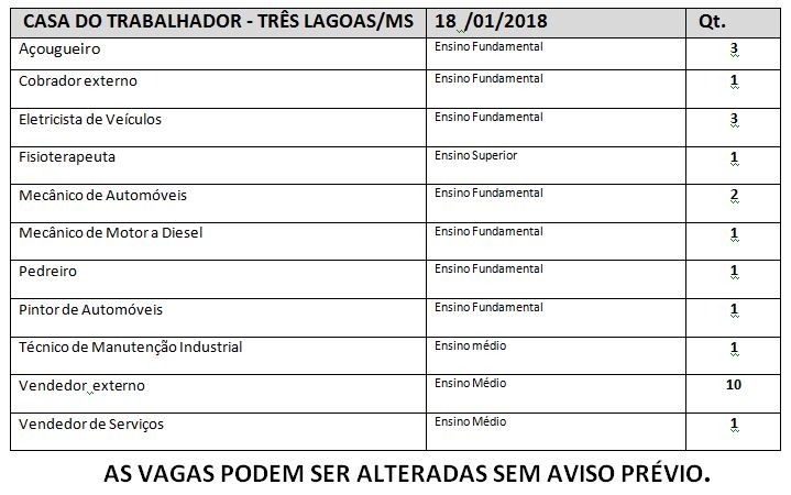 A Casa do Trabalhador de Três Lagoas em parceria com a Funtrab (Fundação do Trabalho de Mato Grosso do Sul) está com 25 vagas de emprego abertas nesta quinta-feira (18) e a oportunidade são para os candidatos que possuem ensino fundamental e médio. Há também vagas para pessoas com deficiência (PCD).