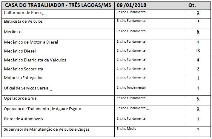 Para hoje as vagas disponíveis são para os cargos Calibrador de Pneus, Eletricista de Veículos, Mecânico, Mecânico de Motor a Diesel, Mecânico Diesel,Mecânico Eletricista de Veículos, Mecânico Socorrista, Motorista Entregador, Oficial de Serviços Gerais, Operador de Grua, Operador de Tratamento de Água e Esgoto, Pintor de Automóveis, Supervisor de Manutenção de Veículos e Cargas.