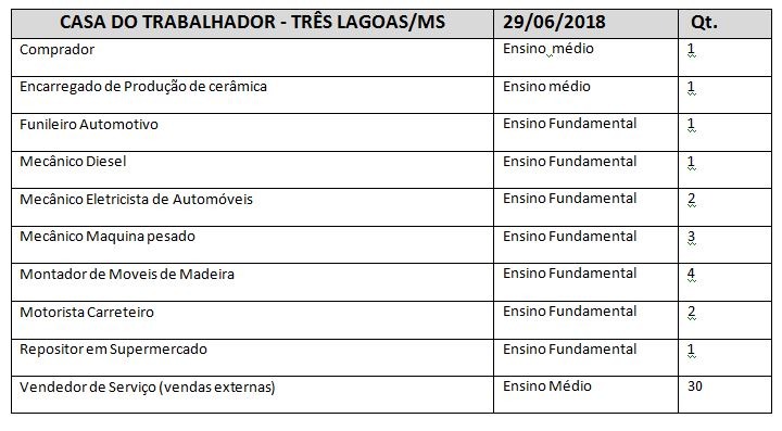 A Casa do Trabalhador de Três Lagoas em parceria com a Funtrab (Fundação do Trabalho de Mato Grosso do Sul) está com 47 vagas de emprego abertas nesta sexta-feira (29) e a oportunidade são para os candidatos que possuem ensino fundamental e médio. Há também vagas para pessoas com deficiência (PCD).