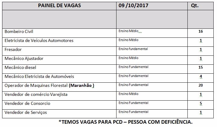 Para hoje as vagas disponíveis são para os cargos Bombeiro Civil, Eletricista de Veículos Automotores, Fresador, Mecânico Ajustador, Mecânico diesel, Mecânico Eletricista de Automóveis, Operador de Maquinas Florestal, Vendedor de comércio Varejista, Vendedor de Consorcio, Vendedor de Serviços.