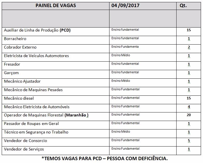 Para hoje as vagas disponíveis são para os cargos Auxiliar de Linha de Produção, Borracheiro, Cobrador Externo, Eletricista de Veículos Automotores, Fresador, Garçom, Mecânico Ajustador, Mecânico de Maquinas Pesadas, Mecânico diesel, Mecânico Eletricista de Automóveis, Operador de Maquinas Florestal, Passador de Roupas em Geral, Técnico em Segurança no Trabalho, Vendedor de Consorcio, Vendedor de Serviços
