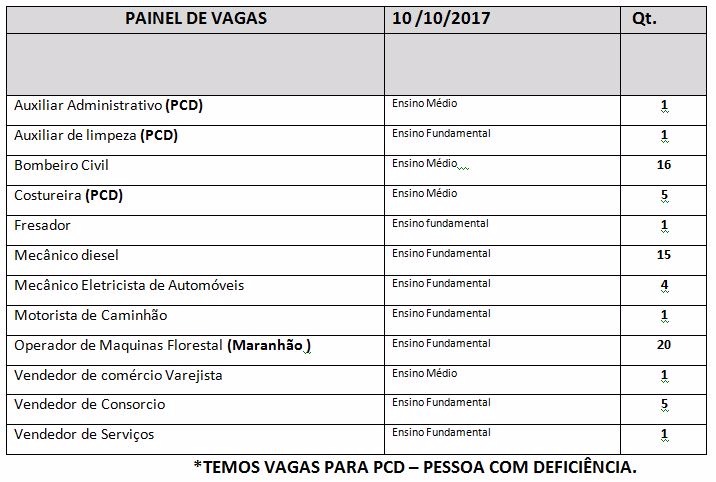Para hoje as vagas disponíveis são para os cargos Auxiliar Administrativo, Auxiliar de limpeza, Bombeiro Civil, Costureira, Fresador, Mecânico diesel, Mecânico Eletricista de Automóveis, Motorista de Caminhão, Operador de Maquinas Florestal, Vendedor de comércio Varejista, Vendedor de Consorcio, Vendedor de Serviços.