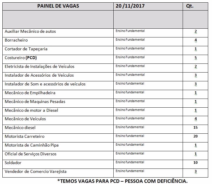 Para hoje as vagas disponíveis são para os cargos Auxiliar Mecânico de autos, Borracheiro, Cortador de Tapeçaria, Costureiro, Eletricista de Instalações de Veículos, Instalador de Acessórios de Veículos, Instalador de Som e acessórios de veículos, Mecânico de Empilhadeira, Mecânico de Maquinas Pesadas , Mecânico de motor a Diesel, Mecânico de Veículos, Mecânico diesel, Motorista Carreteiro,Motorista de Caminhão Pipa, Oficial de Serviços Diversos, Soldador, Vendedor de Comercio Varejista.