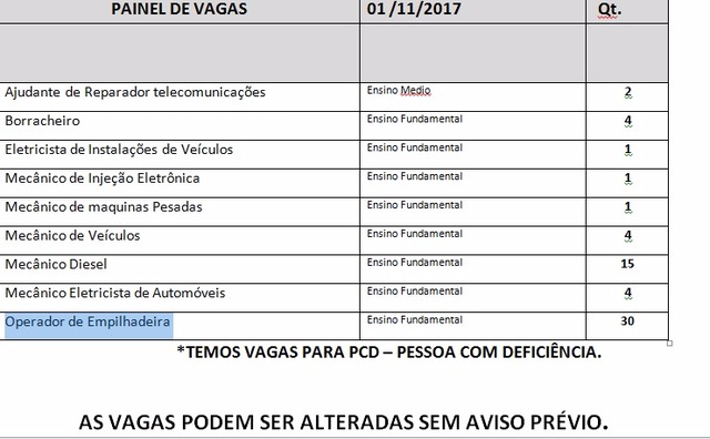 Para hoje as vagas disponíveis são para: ajudante de reparador telecomunicações, borracheiro, eletricista de instalações de veículos, mecânico de injeção eletrônica, mecânico de maquinas pesadas, mecânico de veículos, mecânico diesel, mecânico eletricista de automóveis e operador de empilhadeira