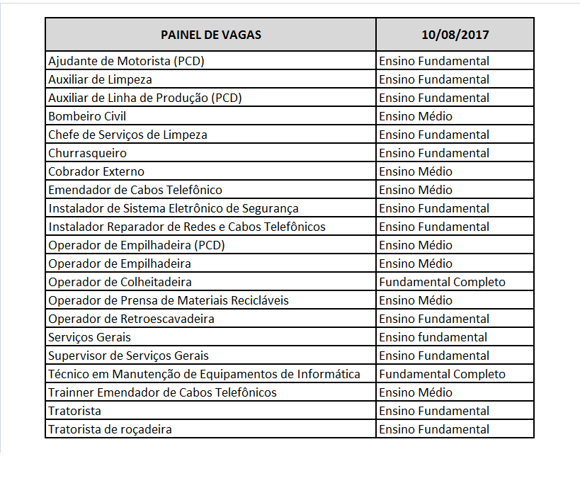 Para hoje (10) as vagas disponíveis são para os cargos de ajudante de motorista, auxiliar de limpeza, auxiliar de linha de produção, bombeiro civil, chefe de serviço de limpeza, churrasqueiro, cobrador externo, emendador de cabos telefônicos, instalados de sistema eletrônico de segurança, instalador reparador de redes e cabos telefônicos, operador de empilhadeira, operados de colheitadeira, operador de prensa de materiais recicláveis, operador de retroescavadeira, serviços gerais, supervisor de serviços gerias, técnico em manutenção de equipamentos de informática, trainner emendados de cabos telefônicos, tratorista e tratorista de roçadeira.