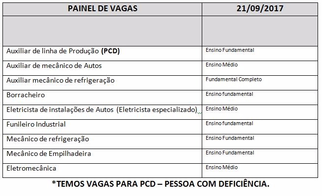 Para hoje as vagas disponíveis são para os cargos Auxiliar de linha de Produção, Auxiliar mecânico de refrigeração, Auxiliar de mecânico de Autos, Borracheiro, Eletricista de instalações de Autos, Funileiro Industrial, Mecânico de refrigeração, Mecânico de Empilhadeira, Eletromecânica.